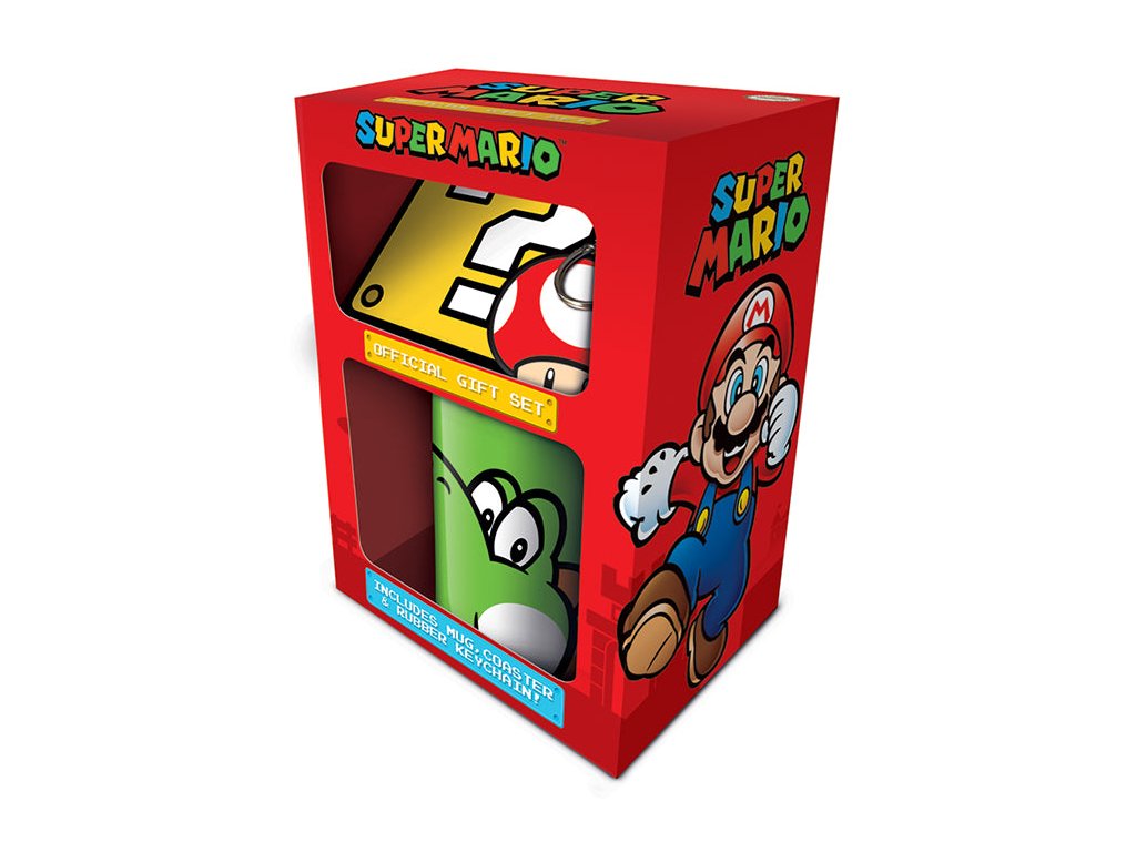 Ten gustowny zestaw podarunkowy uszczęśliwi wszystkich fanów Super Mario. Legendarny nadruk z gry wideo zawiera kubek, podstawkę i breloczek do kluczy, a wszystko to zapakowane w ładne pudełko z przezroczystą ścianą.