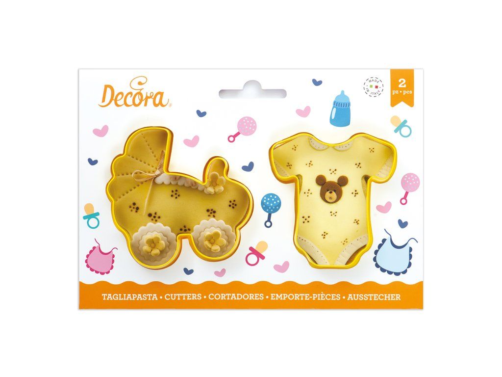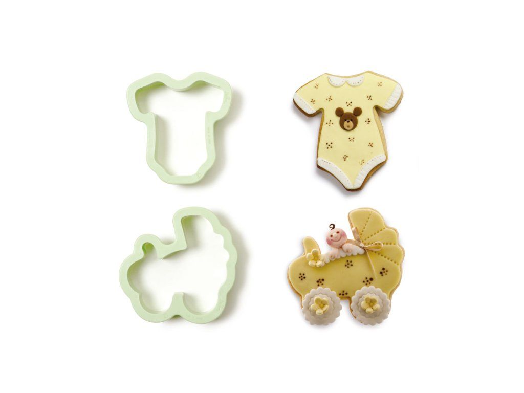 Oryginalny zestaw wykrawaczy w kształcie body i wózka wykonany z plastiku. Wycięte kształty perfekcyjnie ozdobią tematyczny tort urodzinowy albo ciasto z okazji chrztu albo narodzin dziecka. Są odpowiednie nie tylko do wykrawania z fondantu i marcepanu, ale również z piernikowego, biszkoptowego albo innego ciasta.